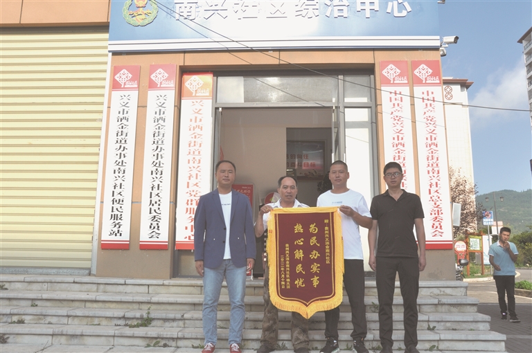 “为民办实事,热心解民优”。金灿灿的大字在红彤彤的锦旗上格外引人注目。8月15日,南兴社区居民杨大国为洒金街道南兴社区送来锦旗,以此表达对社区干部心系群众,为民服务的感激之情。