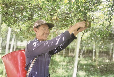 近年来,兴义市始终把精品水果产业作为农村产业革命的重要组成部分,着力在扩规模、提质量、拓市场、增效益上下功夫,全力推动精品水果产业发展,助农增收。右图为村民采摘八月瓜。