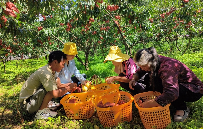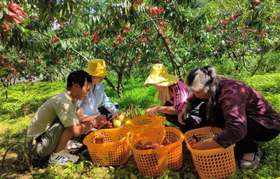 得益于良好的生态环境和高山地势,糯泥村产出的黄桃色泽诱人,果实肥大、果肉橙黄、口感极佳,深受消费者青睐。糯泥村种植黄桃面积近400亩,亩产值在4000元左右,预计将为农户创收140万。左图为村民在采摘黄桃。